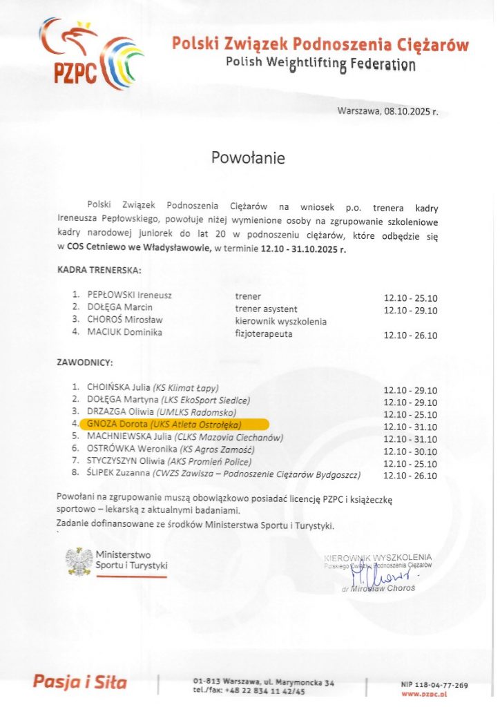 Nasza czołowa zawodniczka DOROTA GNOZA Juniorka Młodsza powołana na zgrupowanie kadry narodowej Juniorek. Dorota będzie uczestniczyła w zgrupowaniu kadry narodowej na terenie Centralnego Ośrodka Szkolenia Ośrodka Przygotowań Olimpijskich Cetniewo we Władysławowie. Cel zgrupowania to przygotowanie do udziału w mistrzostwach Europy Juniorek (18-20 lat), które odbywać się będą w albańskim Durres od 28.10-04.11.2025r.