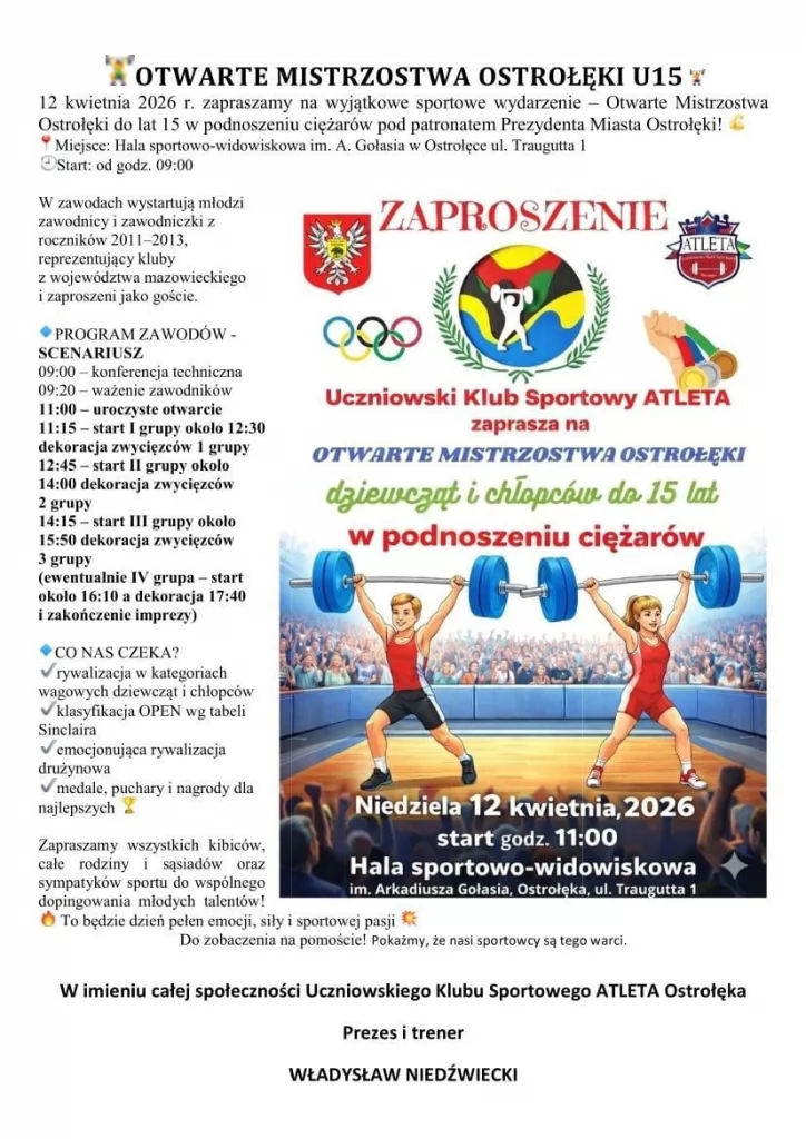 Zaproszenie na OMO dla lat 15 w podnoszeniu ciężareów