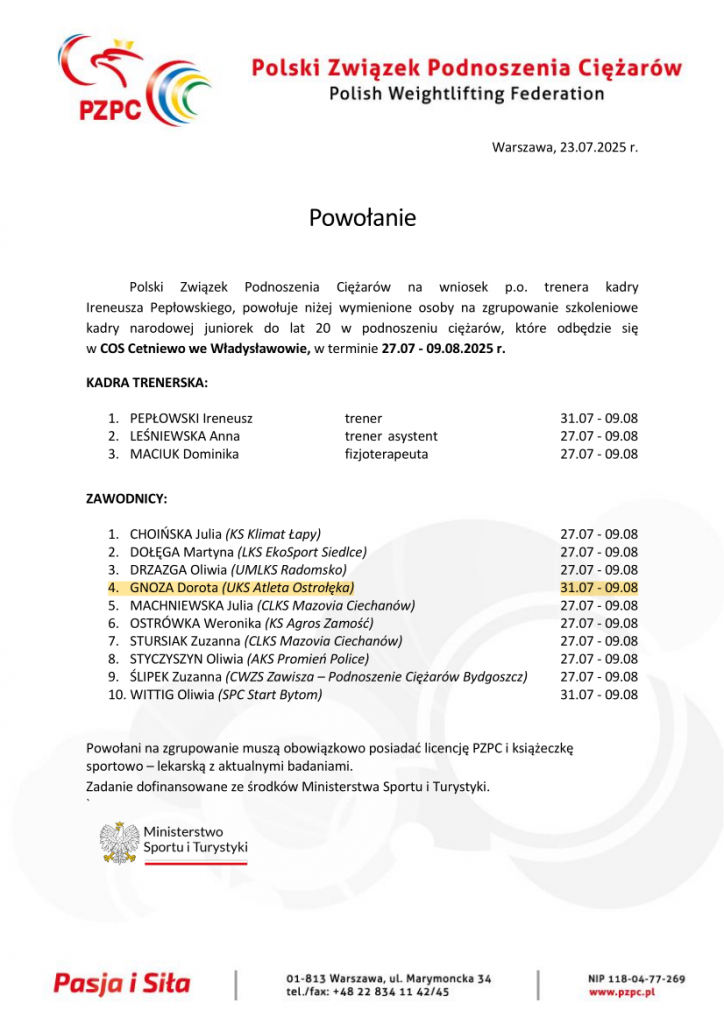 Mistrzyni Polski do 17 lat, trzykrotna rekordzistka Polski i trzecia zawodniczka mistrzostw Europy od dzisiaj przebywa na Zgrupowaniu Kadry Narodowej Juniorek U20 – COS Cetniewo we Władysławowie.